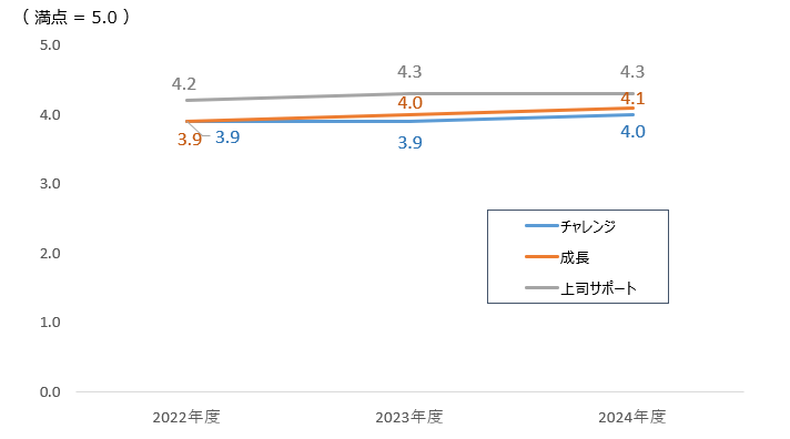 当社は、若手従業員の育成が非常に重要と認識しており、OJTが有効に機能しているかを測る指標として、年次の従業員意識調査における若手従業員の「チャレンジ」、「成長」、「上司サポート」(※3)に関する評価結果を重要視しております。当社はこれらの指標の総合が3点台後半以上となるように評価結果の要因分析、改善対応に努めており、今後もそれを継続してまいります。