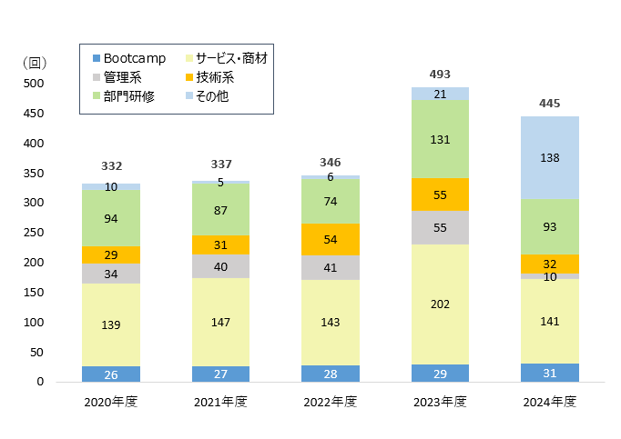 | その他の部門研修 | プロジェクトマネジメント研修(プロジェクト計画、リスク評価・管理、監視・コントロール手法等)、ITサービスマネジメント研修(作業品質向上、運用の継続的改善を目的とした分析方法等)、成功事例共有会等 |