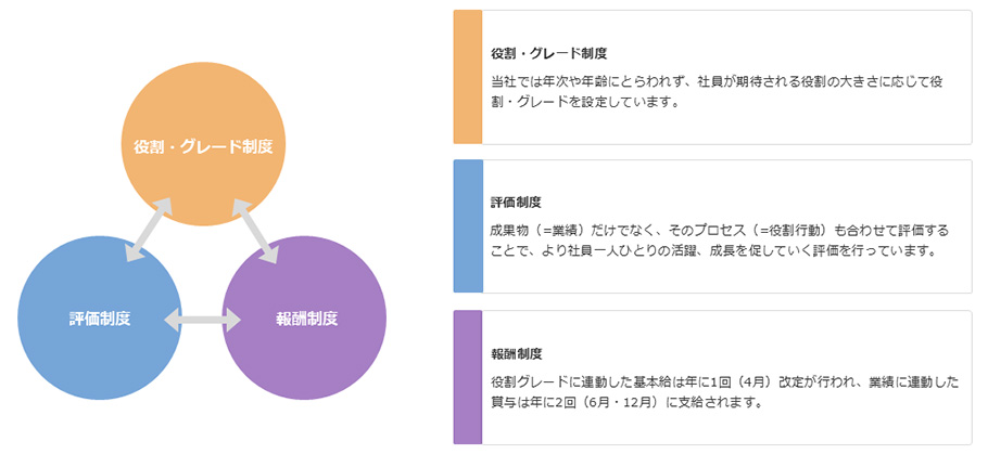 当社は、社員一人ひとりが成長し、企業としてイノベーションを生み出し続けていくことを目的に、人事制度として「役割・グレード制度」「評価制度」「報酬制度」の枠組みを定め、貢献や成果を適切に処遇する仕組みを整えています。