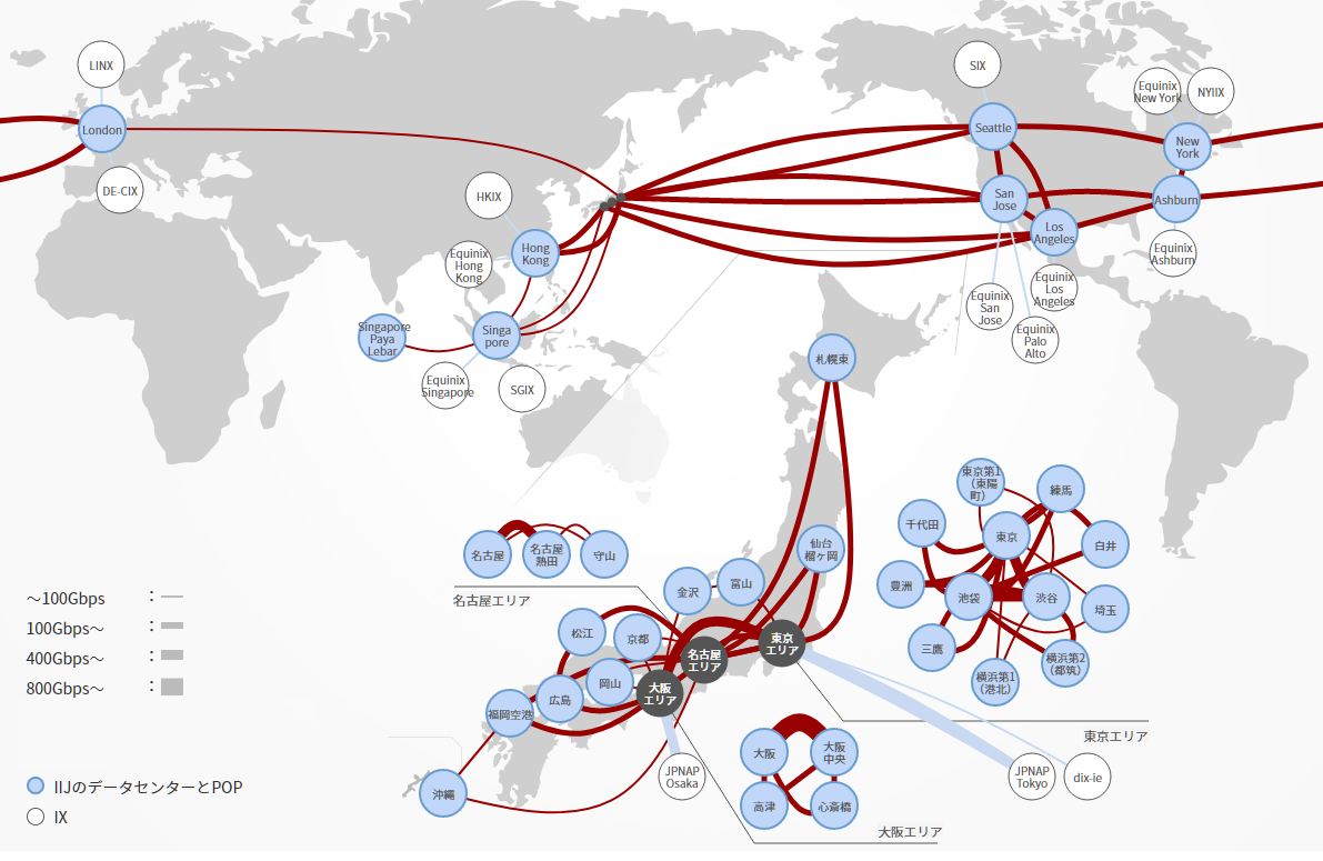 当社が自社運営するインターネット・バックボーンネットワーク(以下、「バックボーン」という。)は国内最大級であり、米国・欧州・アジアへと延伸し、現地法人にてこれらを自社運営することで、グローバルで高品質なインターネット環境を提供しております。インターネットトラフィックの増加にあわせて恒常的にネットワークを随時増強しております。