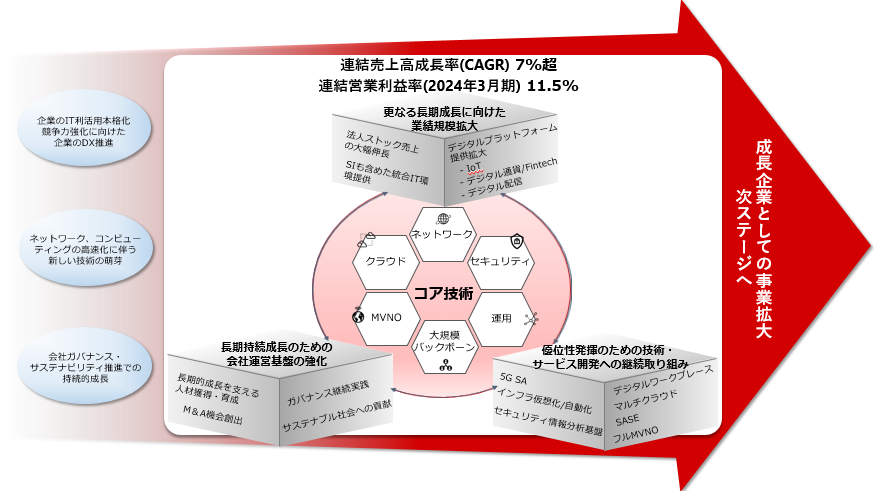 新中期計画において、事業の根幹の絵姿は従前から不変であります。多様な人材が集い自律的に能力を発揮してインターネットとの通信インフラストラクチャー・環境を日本に創り上げたとの自負のもと、高いインターネット関連技術を源泉に、付加価値の高いネットワークサービスを開発し、インターネット関連のネットワーク及びシステムを安定的に運用し、システムインテグレーションの機能も併せて、日本企業等のIT需要に応え支えていくことで、役割を発揮し事業拡大を目指してまいります。特に、2024年3月期におけるサービスインテグレーションでの複数年大型ネットワーク構築案件の増加等の事業状況を鑑み、既存のコアビジネス領域の徹底的な強化により、売上伸長の加速とそれによる利益水準の向上を図ります。また、次の成長に向けた新規領域への取り組みにも注力いたします。それらを実現するための事業基盤の強化にも継続して取り組んでまいります。具体的な内容及び目標は、以下のとおりです。