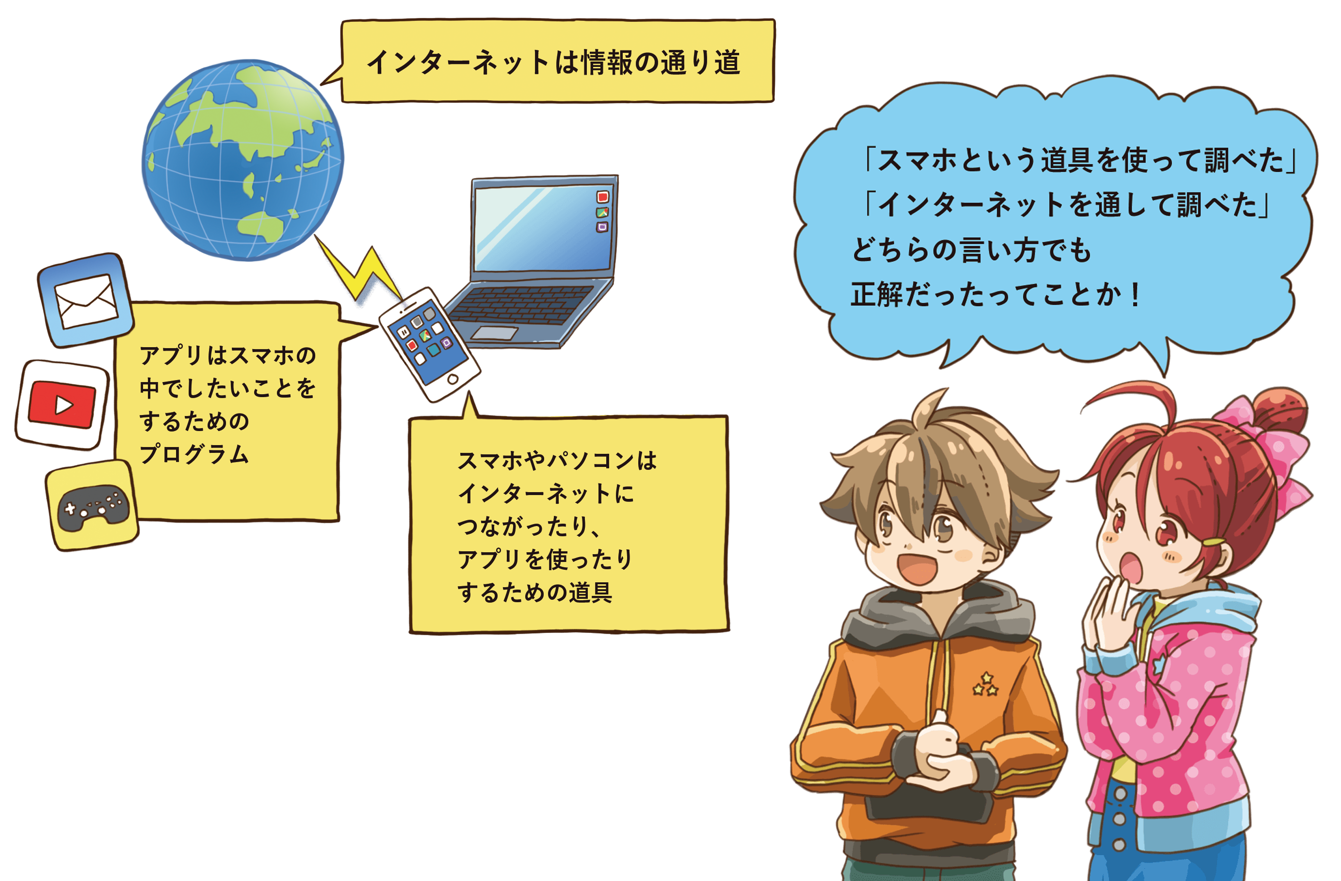 スマホは、そのインターネットとつながったり、アプリを動かしたりするための道具。パソコンのような機能を持った、小さなコンピュータなんだ。だから「スマホという道具を使って調べた」「インターネットを通して調べた」、どちらの言い方でも正解だったんだね。