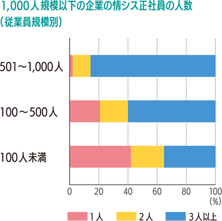 「100人未満規模」の企業では、約4割が情報システム部門の人数が「1人」と回答した。