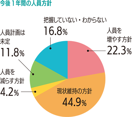 「人員を増やす方針」という企業が22.3%なのに対し、44.9%は「現状維持」との見通しを示した。