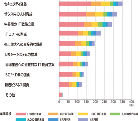 トップは「セキュリティ強化」で、「情シス内の人材育成」、「中長期のIT戦略立案」が続いた。「その他」には、「利用部門のニーズ把握の強化」や「働き方改革への貢献」などが挙げられた。