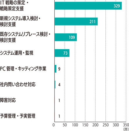 情シス担当者は「IT戦略の策定・戦略策定支援」、「新規システム導入検討・検討支援」などに時間を費やしていることがわかった。