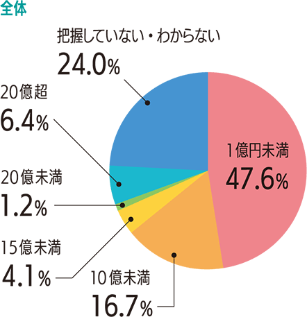 年商規模があがるほど予算が増えるが、「把握していない・わからない」という回答も増える。