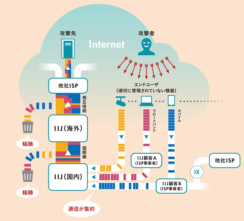 さらに、昨今発生している DDoS 攻撃は、送信先の多くが海外、しかも日本ではほとんど知られていないISPやサイトという特徴があります。ISPにとって上流回線はコストになりますので、通信量が多いISPとはIX(Internet eXchange)などを介して「ピアリング」と呼ばれる原則無料の相互接続を行なうことで上流回線への依存度を下げています。しかし、通信先が普段はほとんど流れない海外となると相互接続には向かず、そのまま上流回線に流れていくため、上流回線を提供するIIJのようなISPへの影響が大きくなります。また、IIJは海外にもネットワークを伸ばしていますが、日本とは高価な国際線で接続しているため、その帯域は日本国内と比較すると小さく、数百Gbpsの突発的な通信が特定の宛先向けに集中的に発生すると、どうしても輻輳しやすくなります。