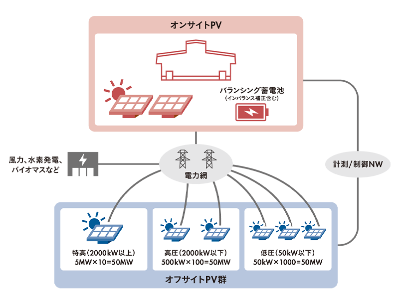 また、カーボンニュートラルの実現には、電力を供給する発電設備とそれを消費するDCが有機的に結合した新しいモデルの創出が求められます。IIJでは、複数の発電所群、蓄電設備、需給制御などを組み合わせた「カーボンニュートラルデータセンターリファレンスモデル」(上図参照)を考案し、ビジネス・技術の両面から実証および社外パートナーとの協力を進めながら、自社DCの改修・新築に適用していく予定です。