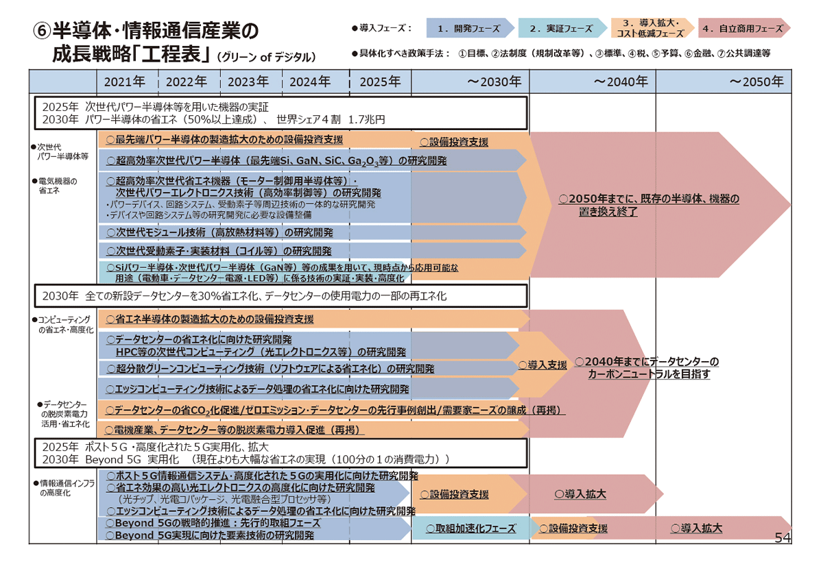 2021年6月、経済産業省が打ち出した「2050年カーボンニュートラルに伴うグリーン成長戦略」(左頁表参照)*1では、2040年までにDCのカーボンニュートラル化を目指すとしています。IIJでも自社で運営している、そして将来建設予定のDCのカーボンニュートラル化に関するタスクフォースを立ち上げ、今後の対応について検討を始めました。