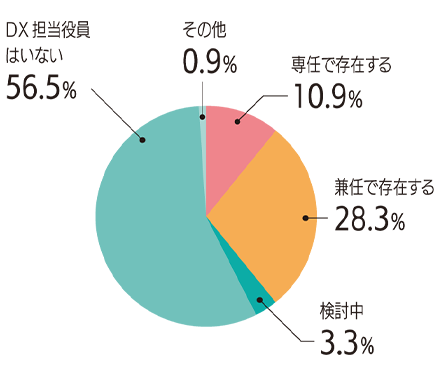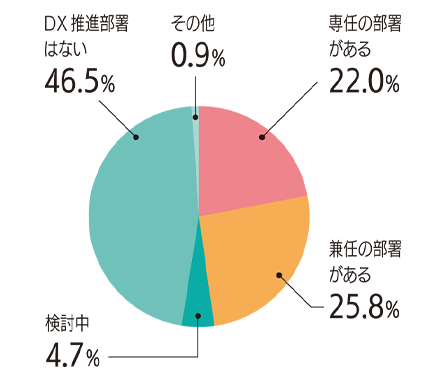 DX 担当役員を置いている企業は約40%、DX 担当部署のある企業は約48%と、半数近い企業が「DX 担当」を設けていることがわかった。