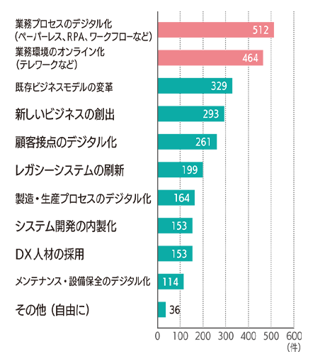 ① 新しいビジネスモデルの創出 ② 既存ビジネスモデルの変革 ③ 顧客接点のデジタル化 ④ DX 人材の採用 ⑤ システム開発の内製化