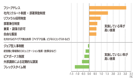 「イノベーション的 DX 実践企業」では、フリーアドレス、社内リクルート、リファラル採用、部署兼任、兼業・副業、自由な服装の採用率が、その他の企業に比べて高いことがわかった。