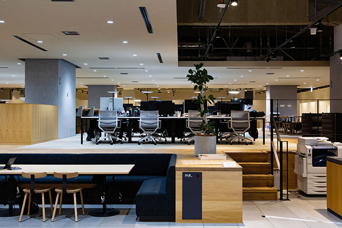 各エリアは一見ランダムにレイアウトされているように見えますが、利便性や快適さには十分配慮しています。天井高が約6mとかなり高いので、仕事モードへの切り替えをうながすために、フロアの4箇所に階段をあがる執務エリア「MORI」を設けていて、ここは天井高を抑えています。各エリアのあいだには、さまざまな人と会話したり、リラックスできるコミュニケーションスペースが配置されています。