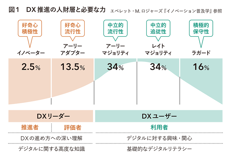 図1 DX推進の人財層と必要な力 (エベレット・M.ロジャーズ『イノベーション普及学』参照)