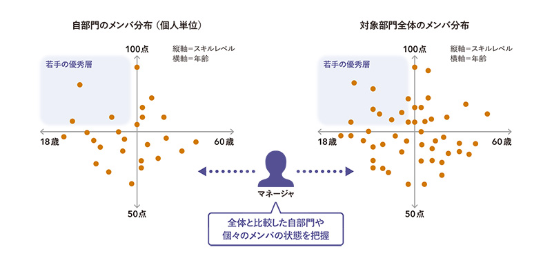 また、従来は年に一度だけアセスメントを行ない、マネジャーごとに個別レポートを作成・展開していましたが、年間を通じて常時アセスメントでき、マネジャー側でも常時レポートを参照できるよう、タレントマネージメントシステムへと刷新しています。