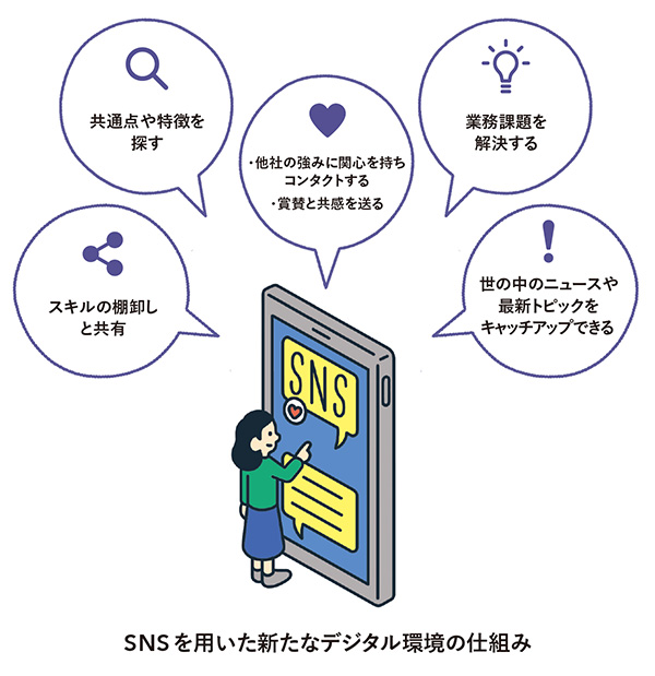 具体的には、タレントマーケットプレイスの概念を取り入れた社内SNSの仕組み作りを進めています。InstagramやFacebookに慣れ親しんだ若手社員に向けた社内SNS上に、部門内のさまざまなアクティビティやビジネス関連の情報、新しいプロジェクトや新サービスにつながるアイデアの種などを会話ベースで流すといったイメージです。利用者(社員個人)のアカウントには、パーソナルデータとして自身が興味を持っている分野やタレントマネージメントシステム上のスキル情報などをタグ付けしておくことで、その分野に詳しい先輩社員を検索できたり、プロジェクト募集者側が必要とする人材を検索できたりします。加えて、取り組みたいプロジェクトなどに気軽にエントリーできる機能も入れていきたいと考えています。