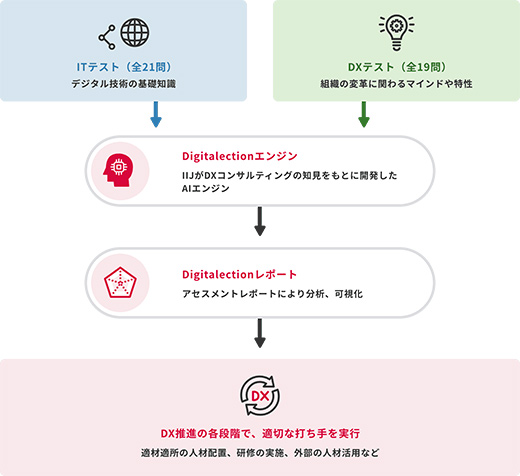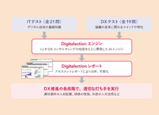 DXプロジェクトを進める人材には、デジタル技術のみならず、変革の能力や意識が求められます。本ソリューションでは、デジタル技術の基礎知識を測る「ITテスト」と、組織の変革に関わるマインドや特性をみる「DXテスト」の結果をAIエンジンで分析し、アセスメントレポートとしてお客さまに提出します。