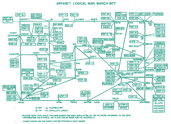 スプートニク1号が宇宙から電波を送信したのが1957年10月4日。その後、米ソ冷戦下でロケットの開発競争が加速し、核戦争の脅威が差し迫るなか、回線交換ともパケット交換とも異なるネットワークの研究がARPANET(図版)から始まりました。