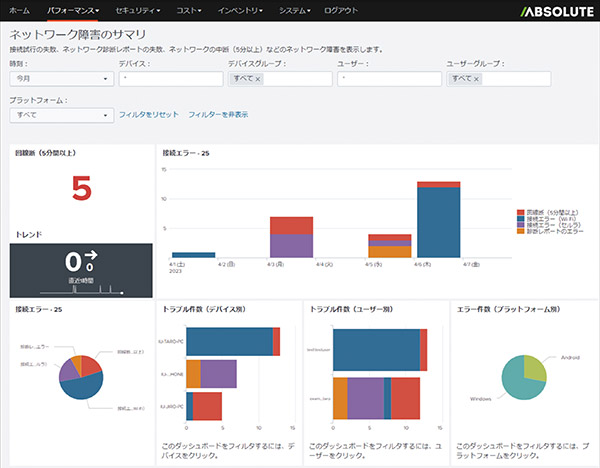 では、実際に「ネットワーク障害」と出ている数字をクリックして、ドリルダウンしてみましょう。すると、新たなダッシュボード(図3)が出てきます。ここでは、接続失敗やネットワーク中断など障害のサマリを見ることができます。また、接続エラーが出ている日にち、エラーの詳細、エラーが発生しているユーザ・デバイス、エラーが発生した場所といった詳細も確認できます。このような確認を通して、つながらないユーザを特定し、原因の“アタリ”をつけることができます。