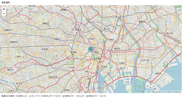 ネットワーク障害が発生している場所は、地図(図4)で確認できます。このケースでは、エラーの発生場所が全て同じであることがわかります。つまり、オフィスネットワークで何か問題が発生している可能性が高いということが予想できます。さらには、Wi-Fiのエラーも出ているので、もしかしたらオフィスWi-Fiに何らかのトラブルが発生しているのかもしれません。そこで、接続エラー(Wi-Fi)ダッシュボードを見てみましょう。(図5)