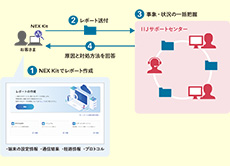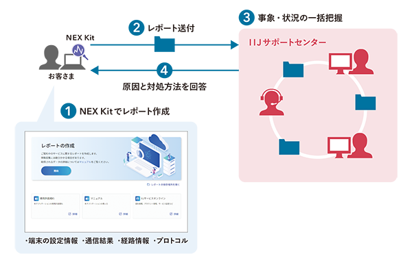 まず、IIJサービスをご利用いただいているお客さまの環境で「つながらない・つながりにくい」という事象が発生した場合、情シスの方が状況を確認し、「NEX Kit」をIIJサービスオンライン*からダウンロードしていただきます。そしてPCなどの端末上で起動・認証・ログインしていただくと、ホーム画面に「レポートの作成【開始】」ボタンが出てきますので、それを押すだけで、IIJ側が切り分けに必要な最低限の情報を収集し、Zipファイルで保存することができます。実にシンプルで、操作も簡単です。