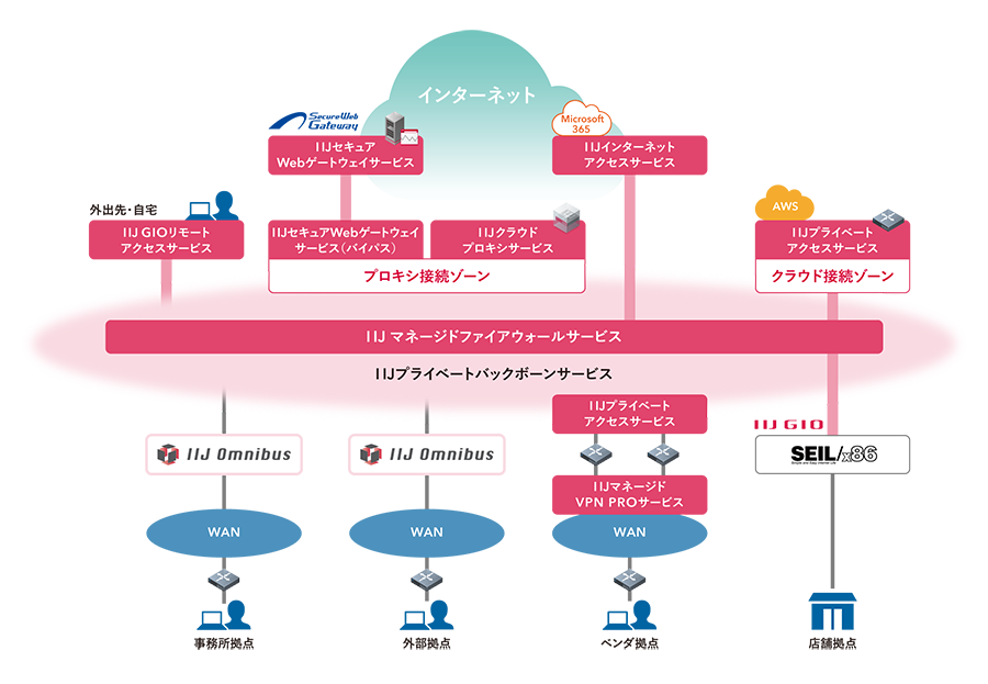 IIJは「IIJデジタルワークプレース」というコンセプトのもと、データセンターからネットワーク、クラウド、セキュリティ対策に至るサービスを網羅的にラインナップしています。特にネットワーク系のサービスにおいては、インターネット接続からプライベートバックボーン、リモートアクセス、マネージドファイアウォール、URLフィルタリング、Microsoft Azure、AWS、GCPなどのパブリッククラウドとの接続など、企業のITインフラを支えるネットワーク基盤に必要なサービスを適宜、組み合わせて、顧客要件に応えています。