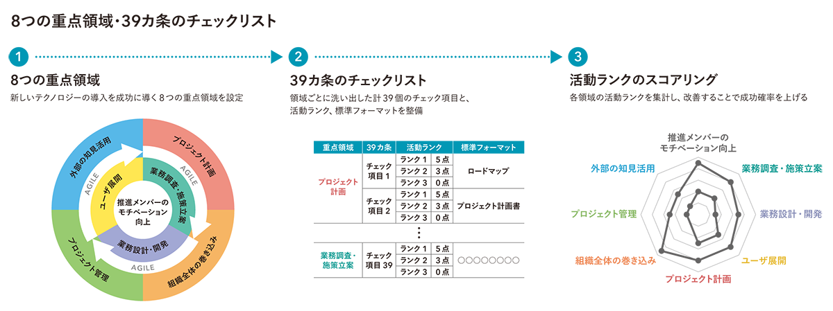 このようなチェック項目がほかに38個あり、活動ランクをもとにスコアリングしていきます。このスコアを参照しながら推進リーダーが自らの活動を改善することで、プロジェクトの成功確率を高めていく――この繰り返しが、新しいテクノロジーの導入を加速させると同時に、推進リーダーの育成にもつながります。