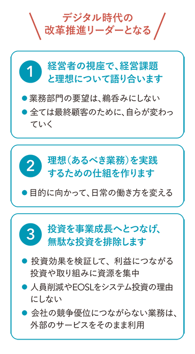 これらを意識すると、投資コストやランニングコストを抑えられ、変革を早く実現でき、属人的になりにくく、軌道修正もしやすくなります。