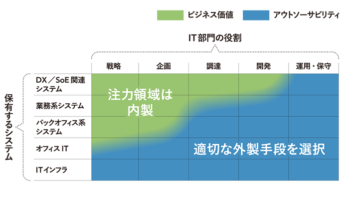 となると、内製と外製を適宜、使い分ける必要が生じます。本当に注力すべき業務を見定めて、内製化するためのリソースを確保しながら、業務上不可欠であるが自社にノウハウを蓄積しなくてもいい分野はアウトソースしていく――そうした体制をつくることが合理的な進め方だと考えられます。(図1)