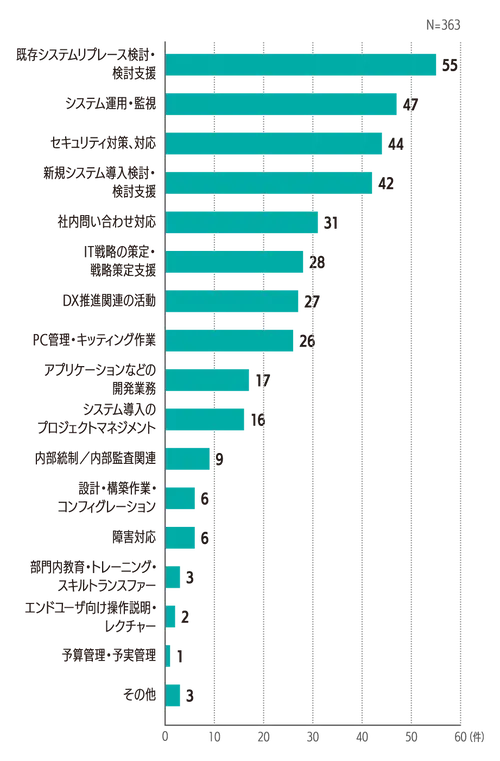 昨年に続き、時間を費やしている業務の1位は「既存システムのリプレース検討・検討支援」。2位~5位も順位は異なるものの、去年と同じ項目がランクインした。
