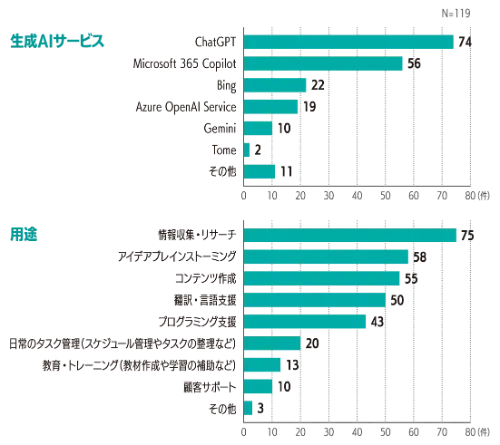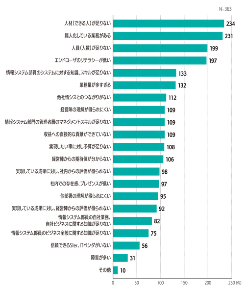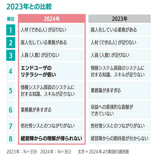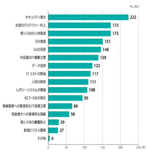 今後、強化すべきことの1位は「セキュリティ」(昨年は2位)。2023年に登場した「DX推進」は今年も同じ4位、2023年に7位だった「AIの活用」は5位となった。2024年に新設した「社員のITリテラシー向上」が2位にランクインする一方、「レガシーシステムの撲滅」は順位を下げた。