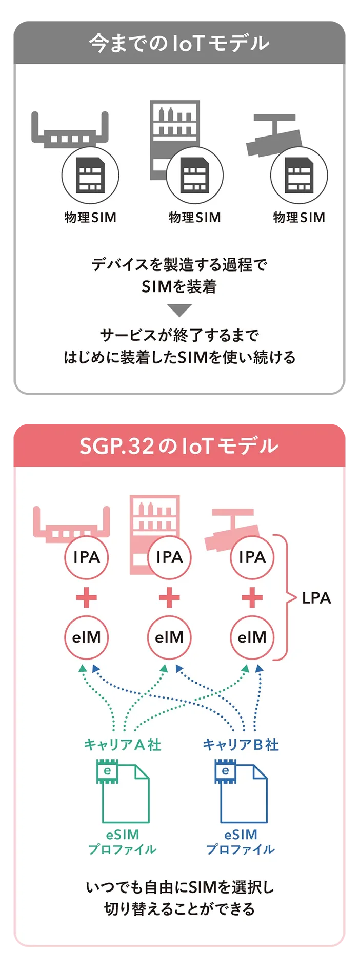 そこでSGP.32では、普及が十分に進んだコンシューマデバイス向けSGP.21/22のアーキテクチャをもとに、端末に実装され大きなリソースを必要とするLPA(Local Profile Manager=eSIMをダウンロードする専用ソフトウェア)を、ダウンロードすべきeSIMプロファイルを選択するeIM(eSIM IoT remote Manager)と、ダウンロードのみに特化した軽量のIPA(IoT Profile Assistant)に分離し、eIMをIoTデバイス外に置くことにしました。これにより、端末メーカや利用者が通信事業者に囲い込まれることなく、希望のeSIMプロファイルをIoTデバイスに低コストでダウンロードできるようになります。