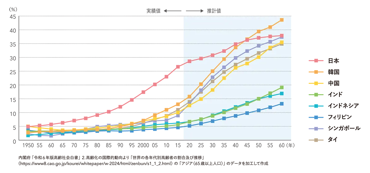 最新の「人口推計」を見ますと、日本では2050年頃まで高齢化率があがっていき、40パーセント近くになります。その間、日本は世界でもっとも高齢化が進んだ国であり続けるわけですが、やがてアジアの国が追いつき、追い抜いていきます(次頁図1)。これは見方を変えると、日本は社会の高齢化を約20年先取りして経験する“課題先進国”だと考えられます。