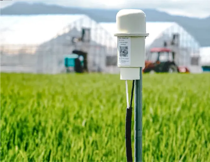 IIJの水田センサ。圃場の水位・水温データを収集し、自宅や作業場など離れたところから、スマホで水位・水温を監視することができる。
