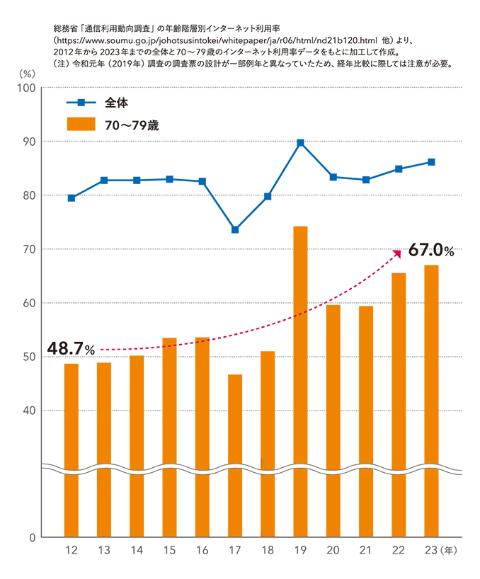 図2 2012年から2023年までのインターネット利用率の推移(全体・70代)