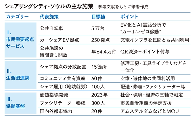 シェアリングエコノミーを都市政策の柱としている都市は「シェアリングシティ」と呼ばれる。韓国のソウル市は、行政主導型シェアリングシティの代表事例であり、世界で最初にシェアリングシティ化を打ち出した都市である。予算を抑えながら福祉や行政サービスの水準を保ち続けるために共助の仕組みとしてシェアリングエコノミーに着目し、2012年にシェアリングシティを宣言した。現在は第三次マスタープラン(2021~25)を推進している。