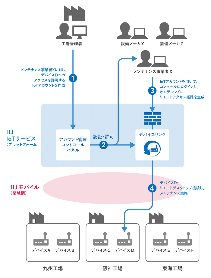 IIoT-SRMでは、閉域網のネットワークを通じてセキュアに遠隔地のデバイスにリモートアクセスする機能や、大量のデバイスを一括でコマンド操作できる機能を提供しています。これにより、遠隔地にあるデバイスを適切に管理できます。また、システムのログインアカウントごとにデバイスへのリモートアクセス許可を制御する認証・認可機能(IoTアカウント)により、アクセスを必要とする外部のメンテナンス事業者にも対応可能です。(図3)