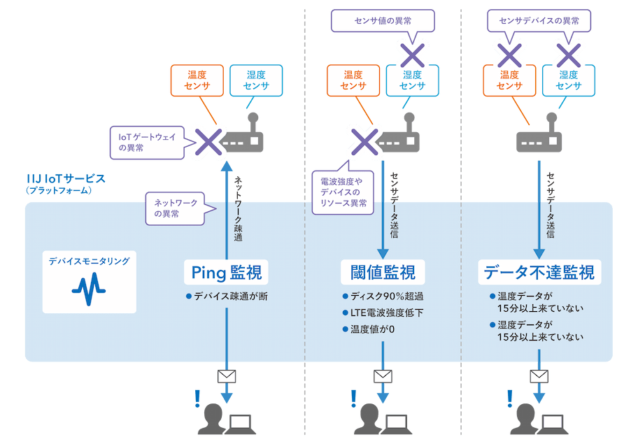 遠隔地に設置した「大量のデバイス」が正常に稼働していることを監視する仕組みも必要です。クラウド環境にVPN接続したうえでPing監視を行なう仕組みや、定期送信されるべきデータが途絶えたことを検知する仕組みなどが考えられますが、VPN機器や監視システムの初期構築・運用の煩わしさや、ITシステムの監視サービスを適用しようとしてもデバイス台数に対してコストが合わないケースも考えられます。