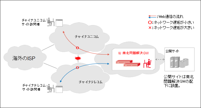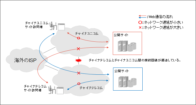 チャイナテレコムのユーザがチャイナユニコムに接続している公開サイトを訪問する場合、海外等のプロバイダ経由となる可能性が高く、アクセスが遅くなります。チャイナユニコムのユーザがチャイナテレコムに接続している公開サイトを訪問する場合も同じです。