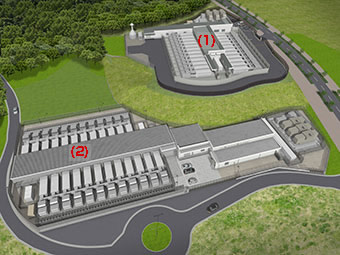 」のファシリティとして活用されています。今後も拡大が見込まれるクラウド需要に対応するため、2013年4月より約半年間をかけて拡張工事を行い、このたび敷地面積及びコンテナ設置スペースを2倍に拡張いたしました。今後、サービスの需要に応じて、コンテナモジュール「IZMO(イズモ)」(特許番号:第5064538号)を段階的に増設していく予定です。