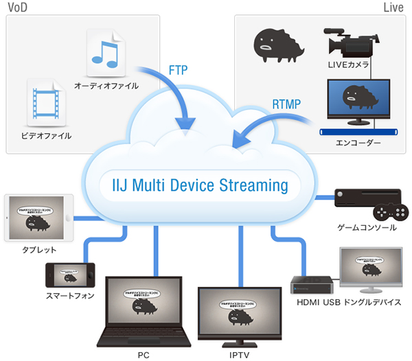 IIJは、視聴環境の多様化におけるコンテンツ配信のニーズに応え、2013年7月より、各種端末に最適な録画コンテンツを配信する「マルチデバイスストリーミング/VoD」を提供しています。このサービスを利用することで、お客様は自社で大規模な配信設備を持つことなく、IIJのコンテンツ配信サーバから、視聴者に録画コンテンツを配信することが可能になります。今回新たに追加した「マルチデバイスストリーミング/Live」(以下、本サービス)は、各種端末に、コンサートやイベントなどのライブコンテンツを配信可能にするサービスです。本サービスの利用により、お客様は多様な端末に、容易かつ安価に大規模なライブ配信が可能になります。