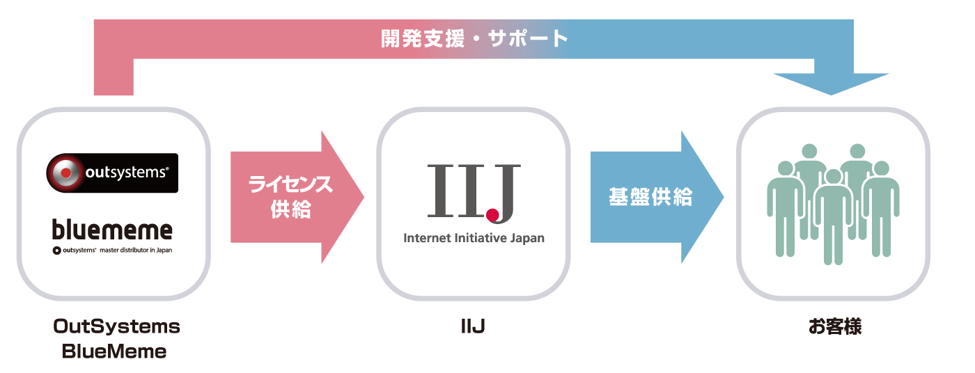 BlueMemeは、「OutSystems Platform」をIIJに供給します。IIJは「IIJ GIO」をお客様に提供するとともに、「OutSystems Platform」をお客様に販売します。「OutSystems Platform for IIJ GIO」及び「OutSystems Platform」を使ったアプリケーションの開発支援およびサポートは、OutSystems、BlueMeme及びOutSystemsのパートナー企業(OutPartner)が行います。