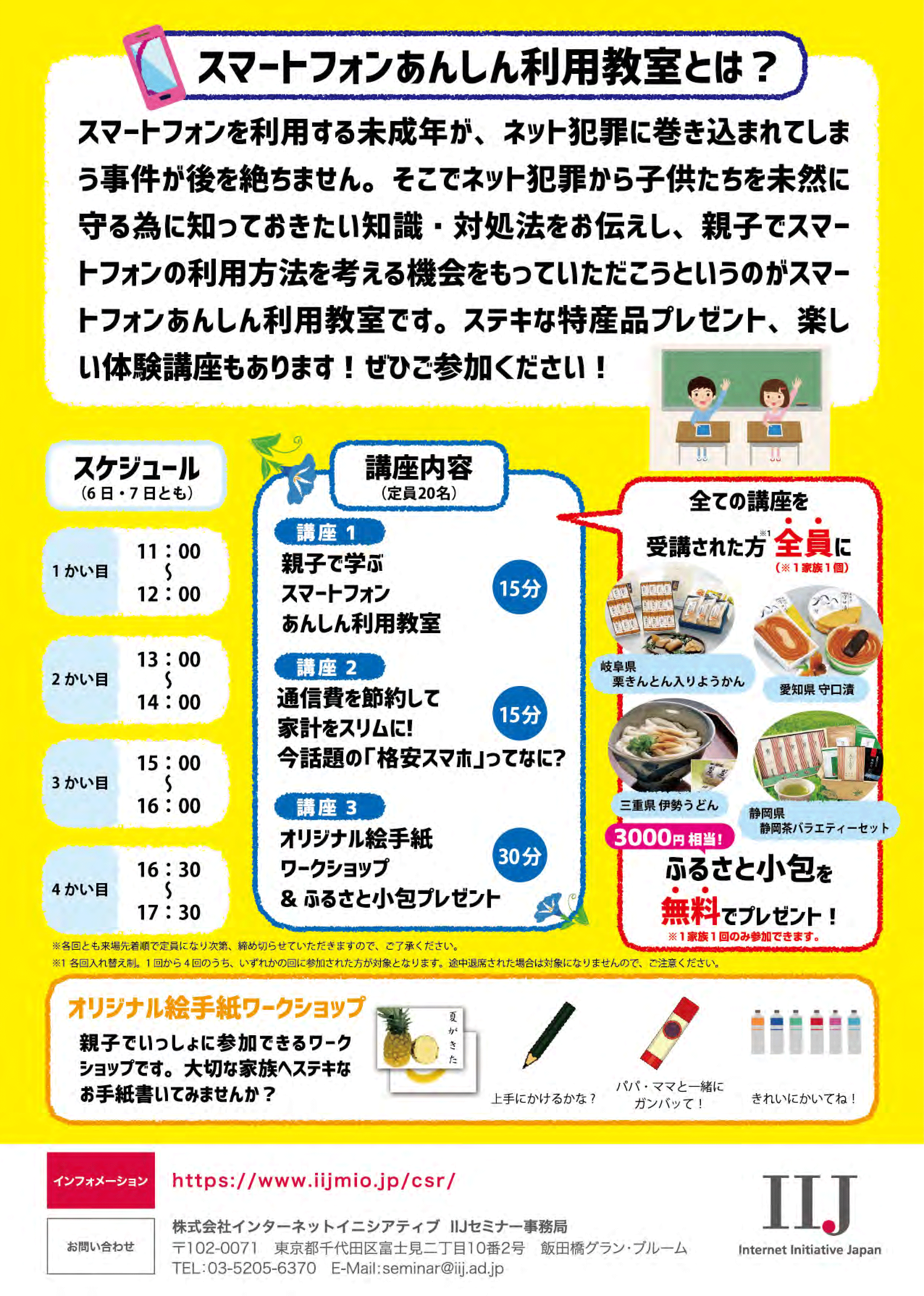 株式会社インターネットイニシアティブ(本社:東京都千代田区、代表取締役社長:勝 栄二郎、コード番号:3774 東証第一部、以下IIJ)は、来る8月6日(土)~7日(日)に、親子向け夏休みイベントとして、「スマートフォンあんしん利用教室」をKITTE名古屋で開催します。