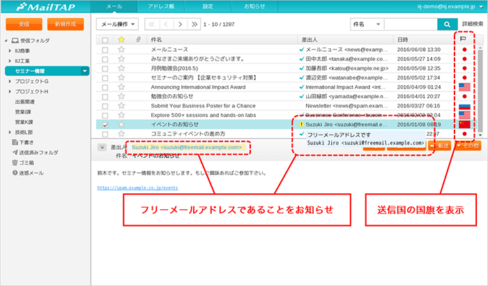 受信メールの送信元IPアドレスから国情報を取得し、受信メール一覧画面に"国旗アイコン"を表示します。どの国から送信されたメールかがひと目でわかることにより、例えば実在する国内企業や組織のドメインになりすますなどして海外のサーバから送信される迷惑メールや標的型メール攻撃等に対する注意喚起につながります。