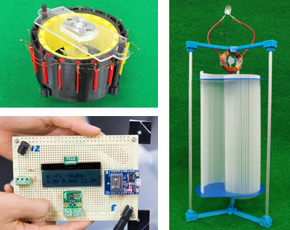 発電機(写真左上)とIoTセンサー(写真左下)、小型サボニウス風車(写真右)