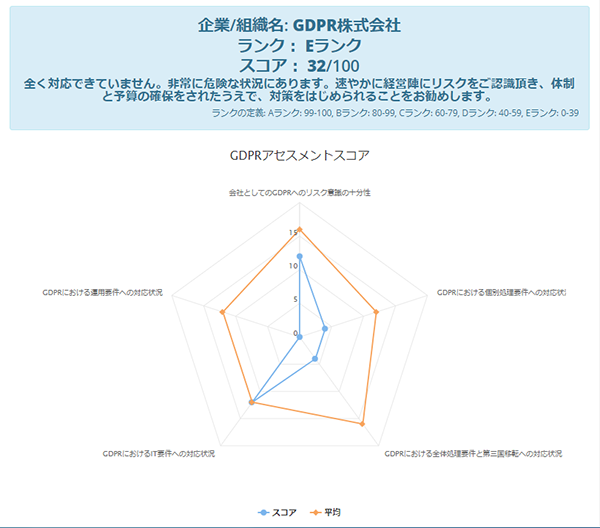 GDPR対応に関する5カテゴリ・25問の質問に回答することにより、自社の取り組み状況を簡単にアセスメントすることができます。結果はレーダーチャートで表示され、お客様は未対応項目を視覚的に理解し、対策立案に役立てることができます。IIJビジネスリスクマネジメントポータルのオプション機能として本日から提供を開始いたします。IIJビジネスリスクマネジメントポータルの登録会員は無料でご利用いただけます。