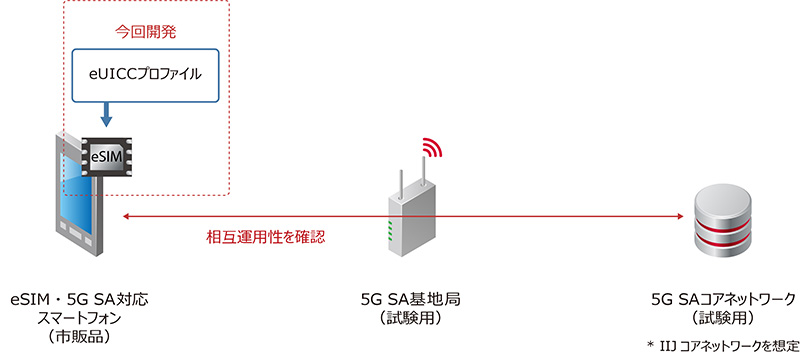 この度IIJでは、GSMA(※2)標準のeSIMに、3GPP(※3)で規格化された5G SA対応の機能を追加したeUICC(※4)プロファイルを搭載のうえ、市販の5G SA対応スマートフォンにダウンロードし、試験用の5G SA基地局、5G SAコアネットワークで動作検証を行い、通信が可能となることを確認いたしました。5G SAに対応したeSIMの開発、動作検証を完了させたのは、IIJが国内初となります(IIJ調べ)。