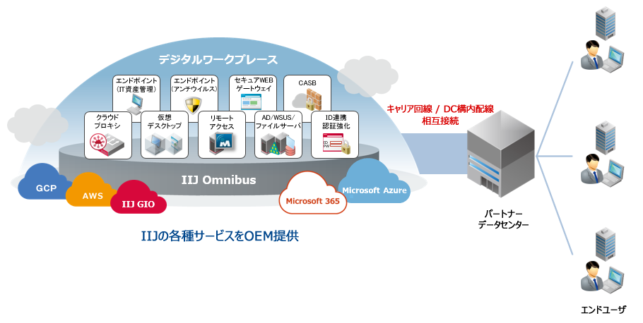 IIJは、SIer向けにネットワークエンジニアが個別構築で提供していたリモートアクセスやセキュリティ、認証といった機能を、パートナーコネクト経由でクラウド型のデジタルワークプレース(DWP)(※2)関連サービスとして提供することで、SIerの課題解決を支援します。SIerは、パートナーコネクトを利用することで、自社エンドユーザに対して、各種クラウドサービスへの接続環境と合わせ、周辺サービスを短期間に提供することが可能になります。さらに特定のキャリアに依存しないマルチキャリア対応のため既存ビジネスとの親和性を保ちつつソリューションラインナップを拡充することが可能です。