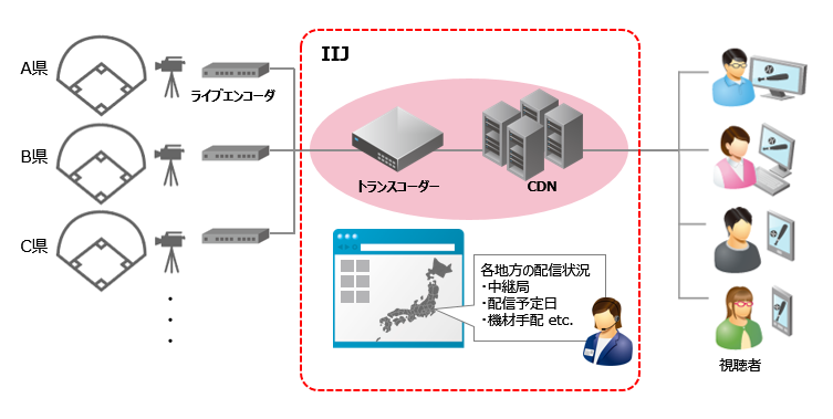 IIJは、ライブストリーミング配信に必要なエンコードシステムをクラウドサービスとして利用できる「ライブ中継ソリューション」の提供に加え、今年は試合の中継作業進捗管理システムを新たに開発し、中継を担当する放送局ごとの中継する試合の進捗状況等を効率的に一元管理することで、昨年に比べ約2倍を超える試合数の配信や、最大100試合の同時配信にも対応します。